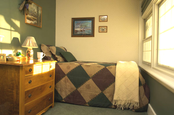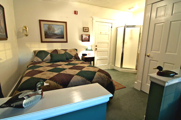 Enjoy the subtle earth tone colors of nature--deep wood tones, hunter green and burgundy. Relax in the overstuffed chairs or take a nap on the queen bed after a day of "hunting" - antiques, golf balls or game! 3/4 bath with shower which is exposed to the room, USB Ports and a twin bed on the enclosed balcony area which is part of the room. This room will accommodate a family of three. Room rate is for two people, add $15/night for each additional guest.